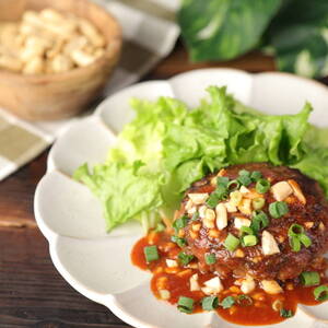 【ハンバーグ】玉ねぎをみじん切りにして耐熱ボウルに入れ、ふんわりラップして電子レンジ(600W)で1分加熱する。