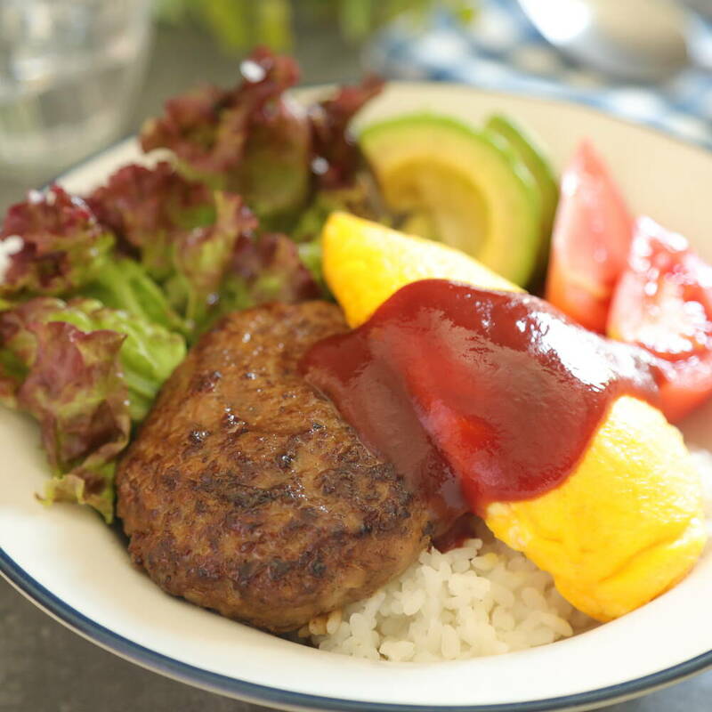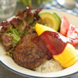 【盛り付け】器にごはんを盛りつけ、お好みの葉野菜などを盛り付ける。<6>を盛り付け、フライパンに残ったソースをかける。オムレツの上に<7>のソースをかける。