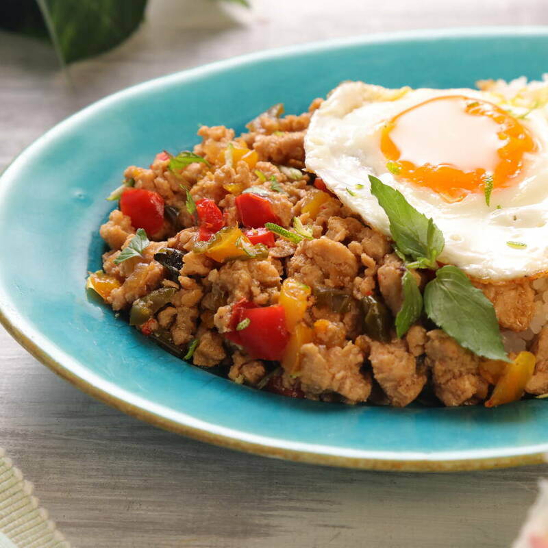 肉の色が変わってきたら、刻んだミント、玉ねぎ、ピーマン、パプリカを入れ、炒め合わせる。【A】を加え、水分が少なくなるまで炒める。