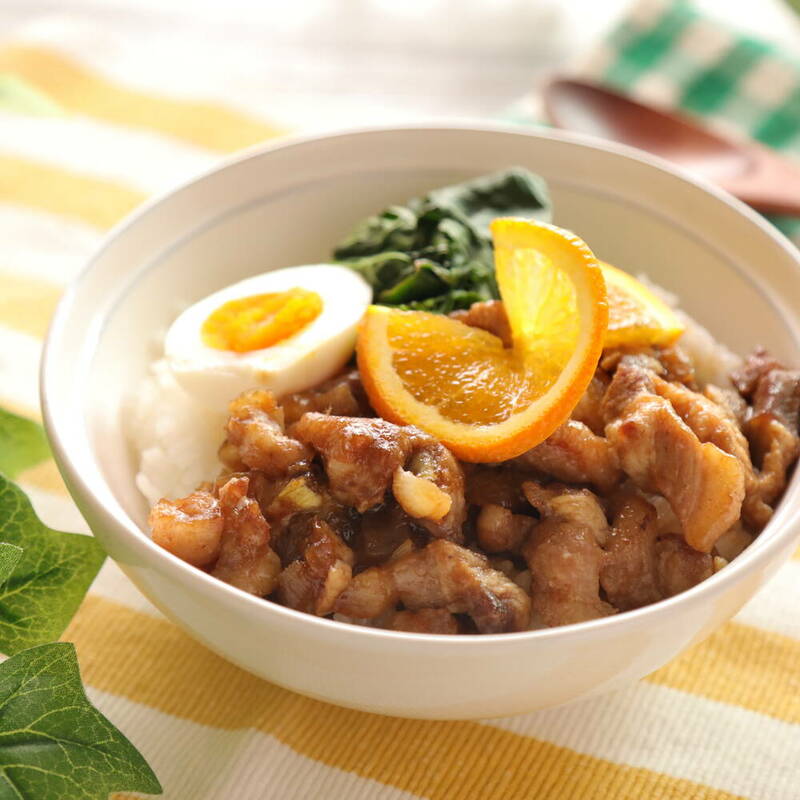 器にご飯を盛り付け<5>をのせ、小松菜、ゆで卵を添える。オレンジは半分に切り込みを入れねじって乗せる。