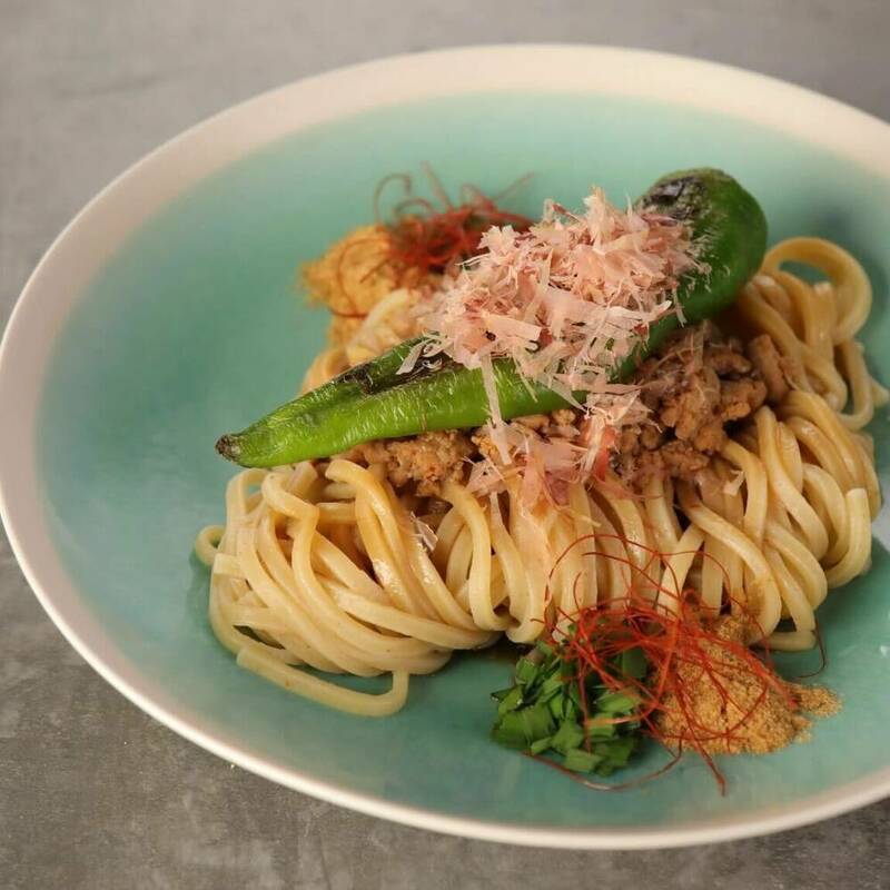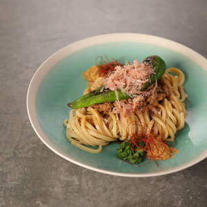 麺の上に炒めたひき肉と万願寺唐辛子を乗せ、かつお節を振りかける。