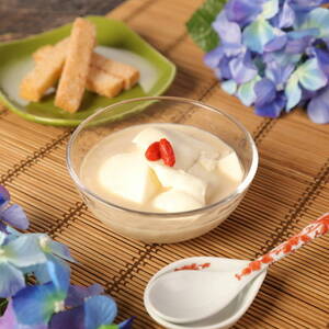 【盛り付け】器に冷やした杏仁豆腐をスプーンですくって入れ、冷蔵庫で冷やしたチャイを注ぎ入れ、クコの実を乗せる。揚げパンを添える。