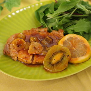 【A】、角切りのキウイフルーツ、レモン果汁を加え、スプーンなどで豚肉にかけながらとろみがつくまで煮詰める。