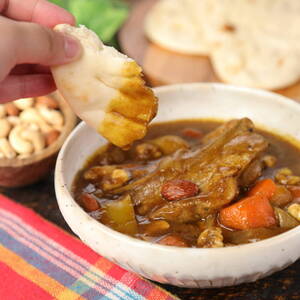 器に<7>を盛り付け、別の器にナンを乗せる。