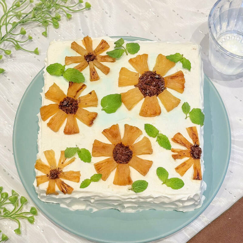 上面にパイン、チョコレート、ミントを使いひまわり畑に見立てて飾りつける。