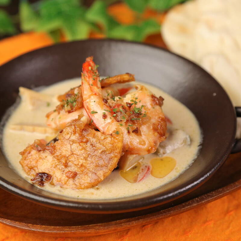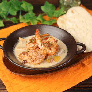器に<9>を盛り付け、中央に<5>をのせる。パセリ(分量外)を散らす。 別の器にナンを乗せる。
