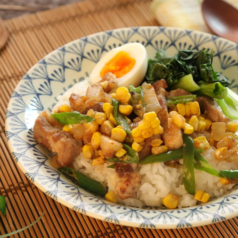 器にご飯を盛り付け<7>を乗せ、小松菜、半分に切ったゆで卵を添える。