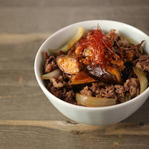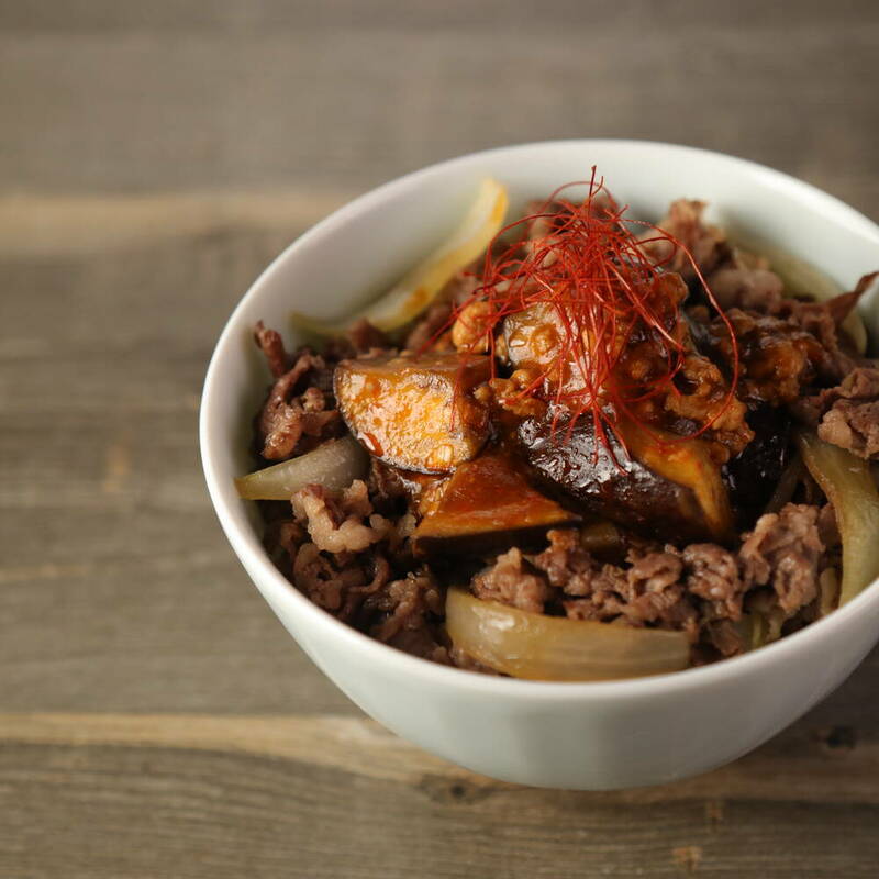 【盛り付け】器にご飯を盛り付け牛肉を外側に、麻婆茄子を中心に乗せる。糸唐辛子を飾る。