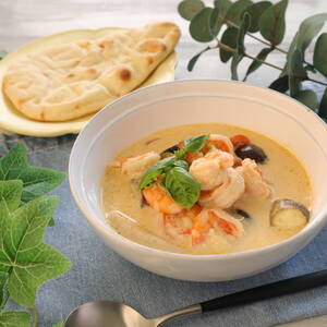 10分程度煮込んだら【B】を加えてひと煮だちさせる。器に盛り付け、バジルを添える。