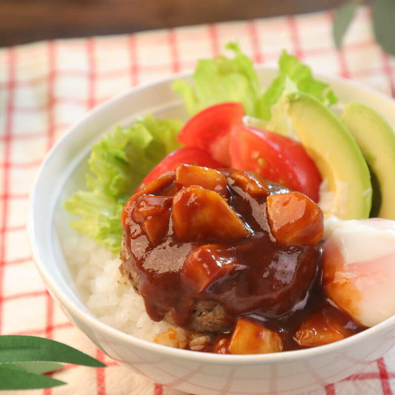 【盛り付け】器にご飯を盛り、<5>を盛り付け、<6>をかける。グリーンリーフ、アボカド、トマトを彩りよく盛り、温泉卵をのせる。