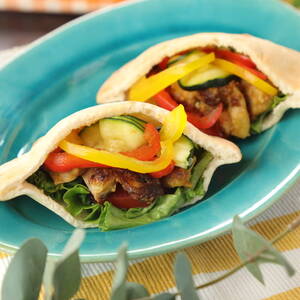 ピタパンにグリーンリーフ、トマトを入れ、<6>、<1>の順に挟む。