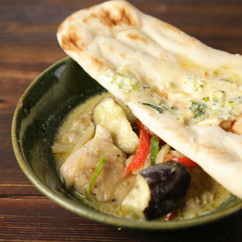 器に<5>を盛り付ける。ナンに<7>を塗り、器に盛り付ける。