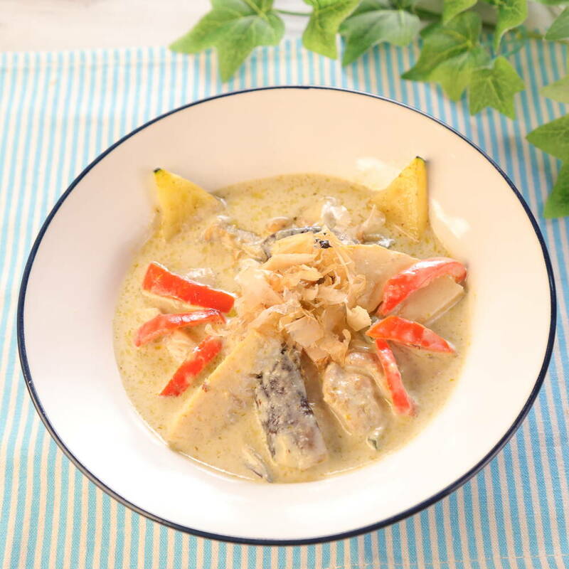 香りが立ってきたら具材と炒め合わせ、ココナッツミルクを少しずつ加え、溶きのばす。ココナッツミルクが全量入ったら弱火にして5〜7分、蓋をして煮込む。