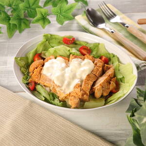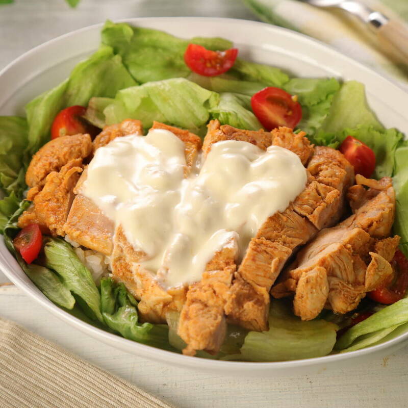 皿にごはんを盛り、レタスをのせる。ごはんの上に<6>をのせ、<3>をかける。お好みで粗びき黒こしょうをふる。