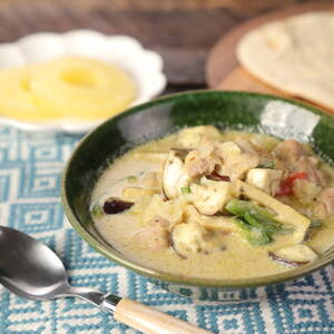 香りが立ってきたらココナッツミルクを少しずつ加え、溶きのばす。<1>と鶏肉を加え、10分煮込む。