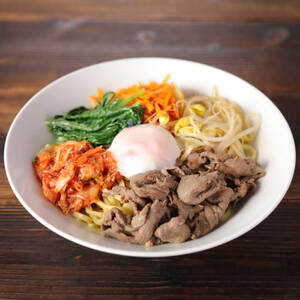 器に麺を盛り<4>のナムルと<6>の牛肉とキムチをのせる。中央に温泉卵を盛り付け。
