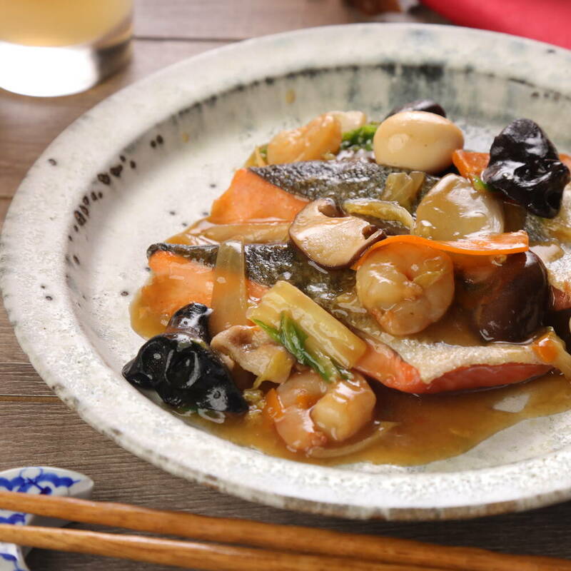 別のフライパンにサラダ油を引いて中火で加熱して、鮭の皮面を下にして並べる。両面しっかりと焼き色がついたら器に盛り付け、<6>をかける。
