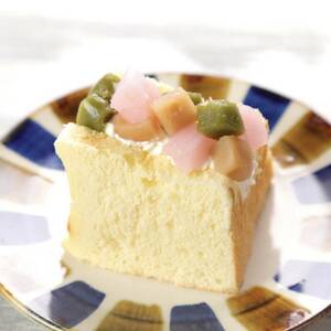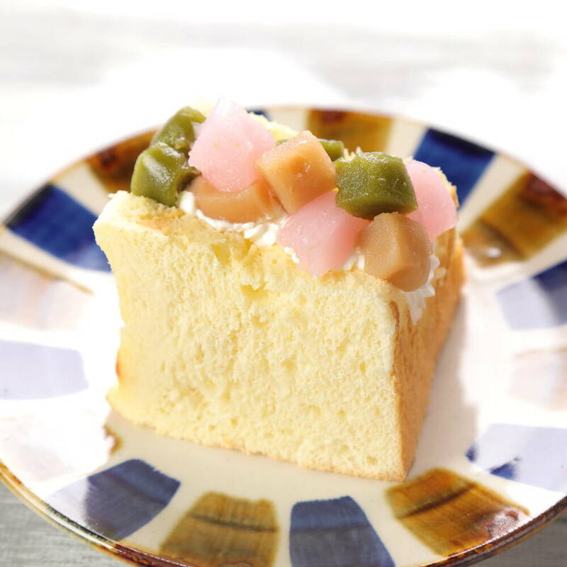 【仕上げ】抹茶や桜、白餡などお好みのういろうを1cmの角切りにする。カットしたシフォンケーキの間にホイップクリームを絞り、ういろうをのせる。
