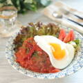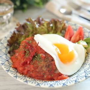 器にごはんを盛りつけ、お好みの葉野菜などを盛り付ける。<5>を盛り付け、<8>をかける。目玉焼きをのせる。パセリを散らす。