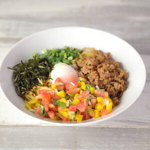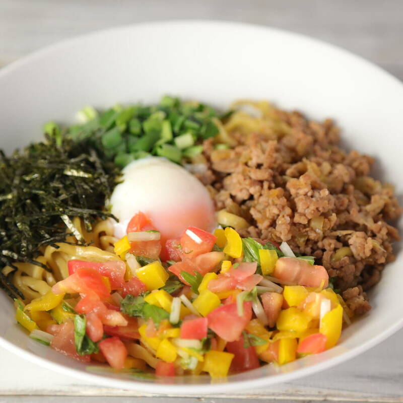 ザルにあげ流水でしめ、水気をしっかり切ったらボウルに入れる。【B】を加えて麺と和えたら器に盛り付ける。