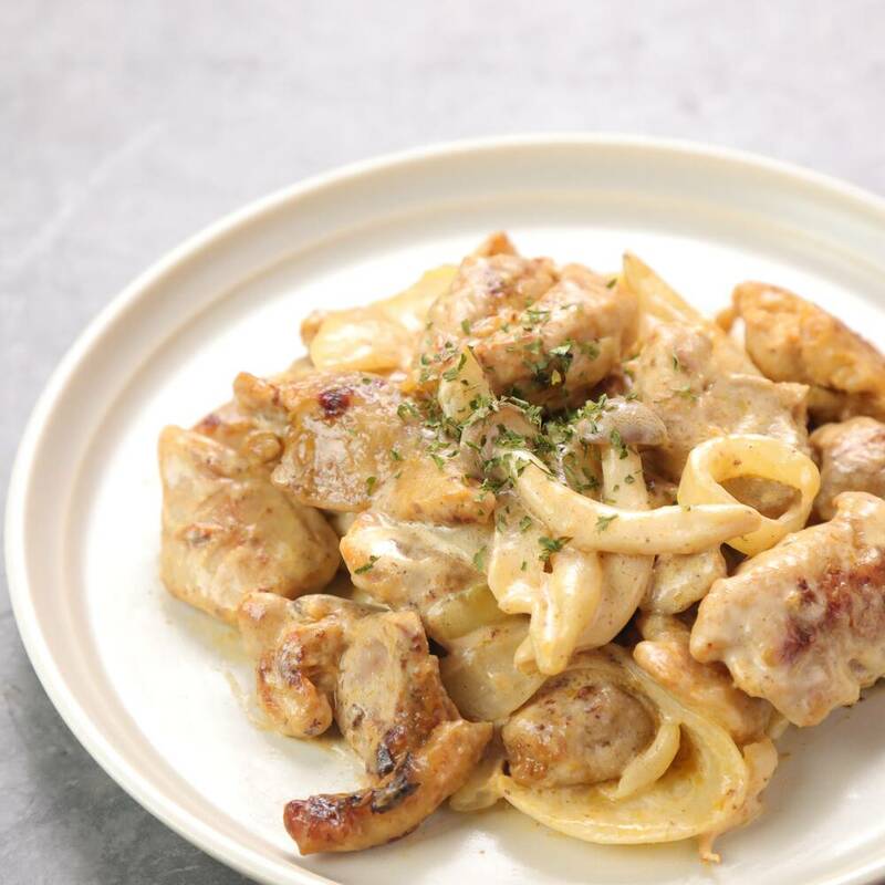 玉ねぎを厚めにスライスする。鶏肉を一口大に切る。しめじは石づきを取り除き小房に分ける。