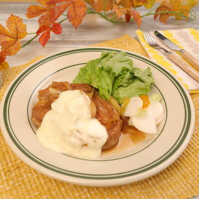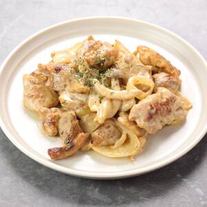 両面に焼き色がついたら、玉ねぎとしめじを入れてしんなりするまで炒める。焼けたらバットに取り出す。