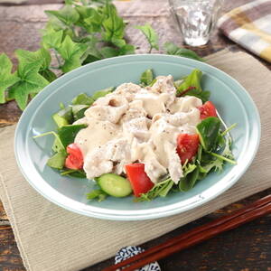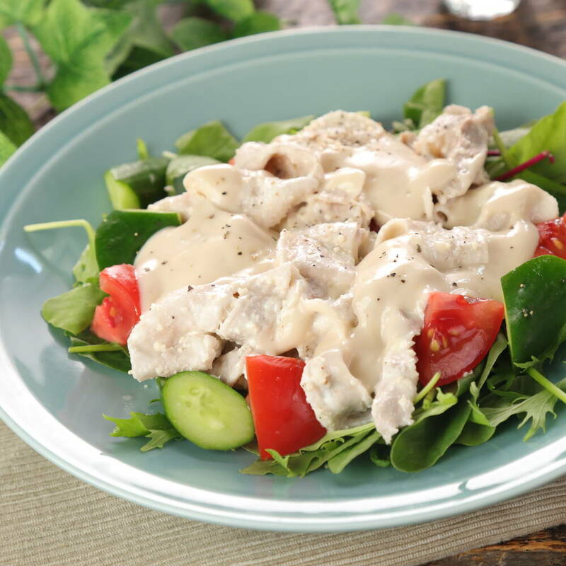 食べやすい大きさにグリーンリーフを千切って器に敷く。トマト、きゅうりを並べて豚肉を盛りつける。