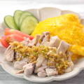 鶏肉に火が通ったら食べやすい大きさに切って、<8>に盛り付ける。鶏肉の上に<5>をかけ、<1>を添える。