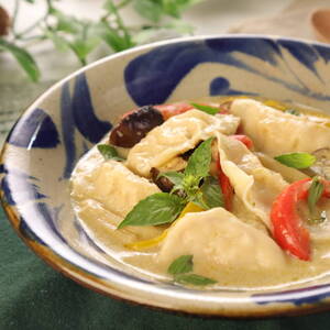 別の鍋にお湯を沸かし、<3>をゆで3~4分茹でる。浮かんできたらすくい取り、<6>に加え、1分程度煮込む。
