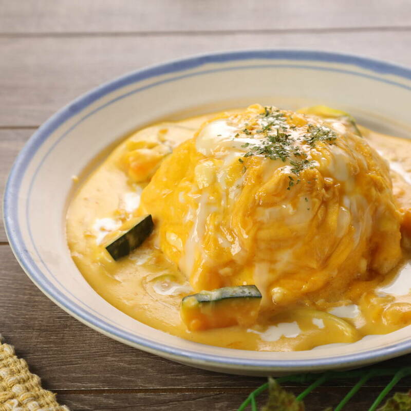 【ポタージュ】 かぼちゃの1/3量は2cm幅に切る。残りは皮をむいて乱切りにし、耐熱ボウルに入れてふんわりラップし、電子レンジ(600W)で4分加熱する。熱いうちに潰す。玉ねぎは薄切りにする。