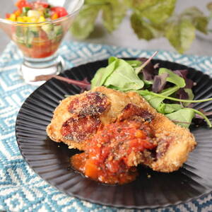 薄力粉、卵の順につけ、盛り付ける側(脂身面が右側)の表面にサラミを5枚貼る。パン粉をしっかりと押さえつける。
