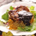 【ブラックデミグラスソース】小鍋に赤ワイン、にんにく、しょうゆを入れて火にかけ、1/4程度になるまで煮詰める。