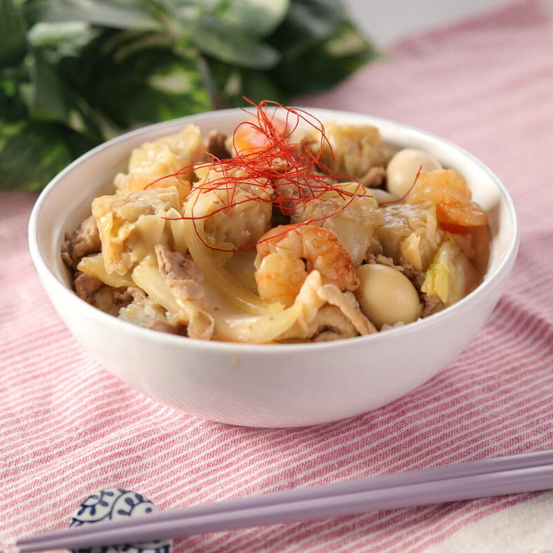 フライパンにサラダ油を熱し、豚肉、むきえびを炒める。