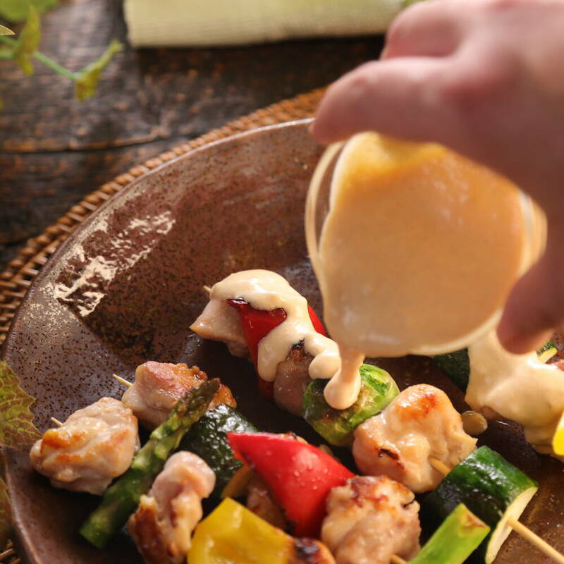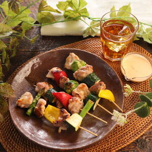 鶏肉は2cm角に切る。串に鶏肉と野菜を交互に2~3個ずつ串打ちする。全体に塩、粗びき黒こしょうをする。