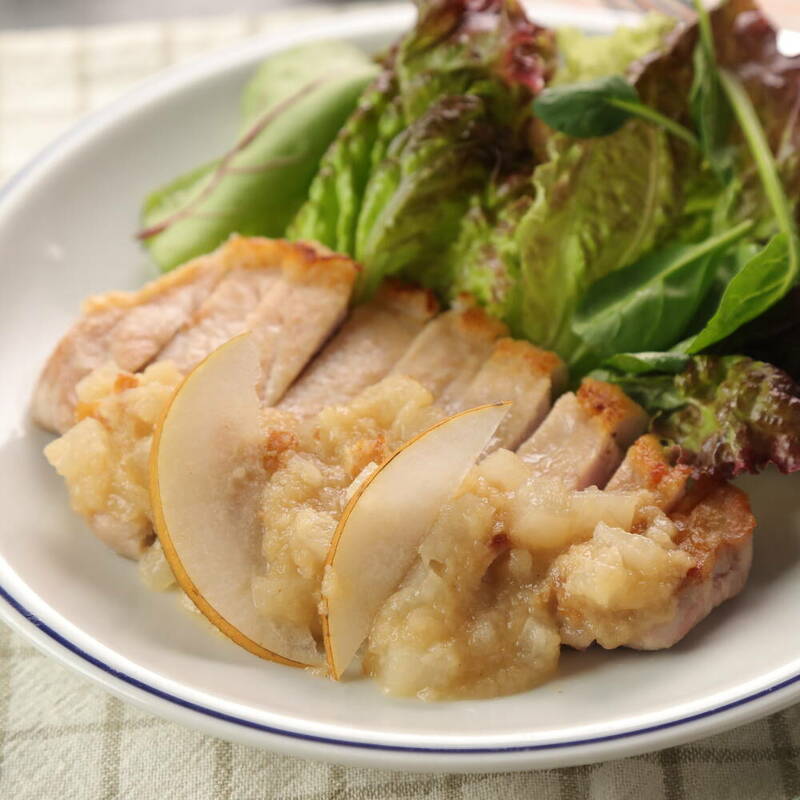 なしは半分は皮を剥いてすりおろす。半分は飾り用に4枚程度薄切りにして取っておき、残りは1cmの角切りにする。