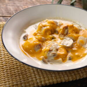 小鍋に牛乳1/3程度と<9>を入れ、混ぜ合わせ中火にかける。馴染んだら徐々に牛乳を加えていき、塩で味を調える。