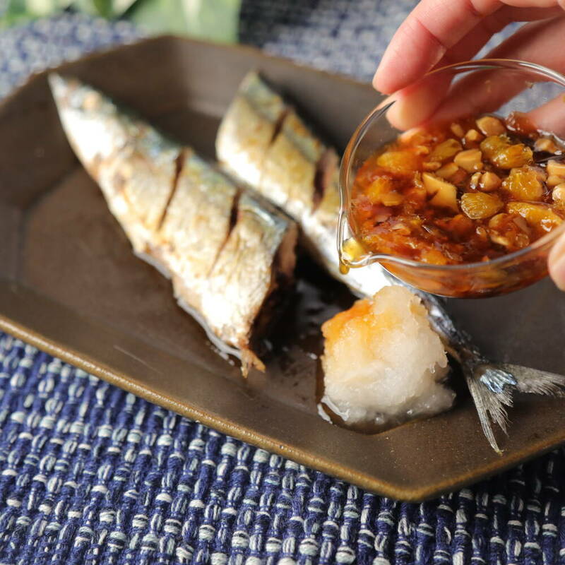 器に秋刀魚を盛り付け、大根おろしの水気を軽く搾り、右下に山高くおく。<11>をかける。