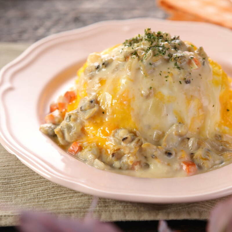 小さなフライパンにバターの半量を中火で熱する。卵液を半量流し入れ半熟状になるまでかき混ぜる。半熟状になったら火を止めそのまま予熱で下が固まるまで待つ。<6>の上にスライドさせてのせる。もう一枚同様に焼く。