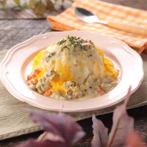 <3>をかけ、生クリームをかける。ドライパセリを散らす。