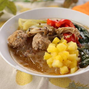 器に<9>を入れ、<8>を注ぎ入れ、具材を彩りよく盛り付ける。<1>を盛り付ける。