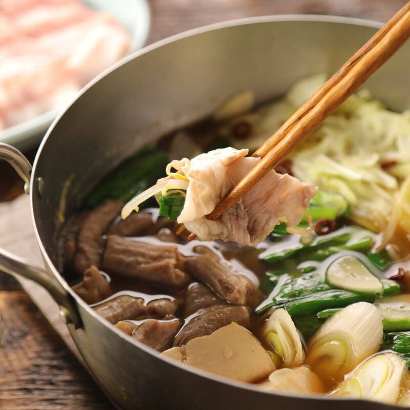 鍋に【A】、キャベツを入れ、火にかけます。沸いてきたら、もつ、もやし、長ネギ、にんにくの半量、唐辛子の半量を加える。