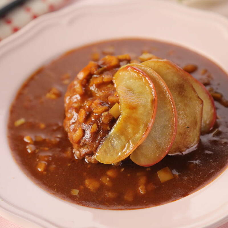 <6>のフライパンの余分な油を拭き取り、デミグラスソース、水、ウスターソース、ケチャップ、<1> の角切りのりんごを入れてひと煮立ちさせる。