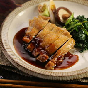 器に鶏肉、<11>を盛り付け、<9>をかける。温泉卵を器に割り入れ、添える。