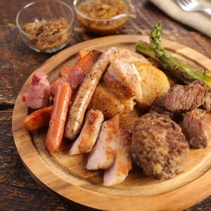 別のフライパンにサラダ油を引いて中火で熱し、ハンバーグ、鶏肉を並べて焼く。両面にしっかりと焼き色がついたら酒を加えてふたをし、弱火で5分ほど蒸し焼きにする。