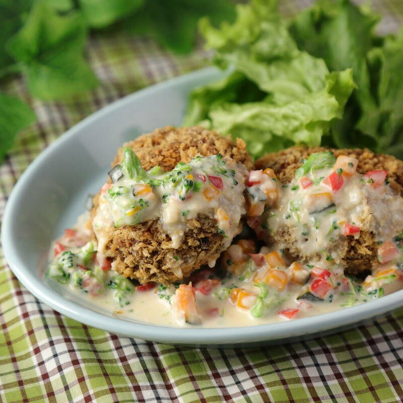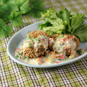 鍋などにサラダ油を入れて熱する。パン粉や箸などで温度を確かめ170℃になったら<5>の形を整えて静かに入れる。