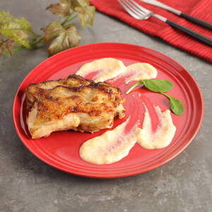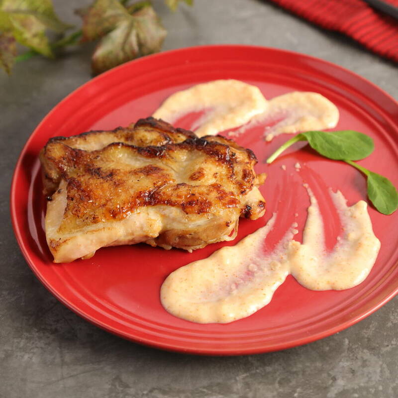 フライパンにサラダ油を入れ中火で加熱する。鶏肉から出た余分な水分をペーパーで拭き、皮目から焼く。ヘラなどで鶏肉を押し付けながら焼き皮をパリっとさせる。