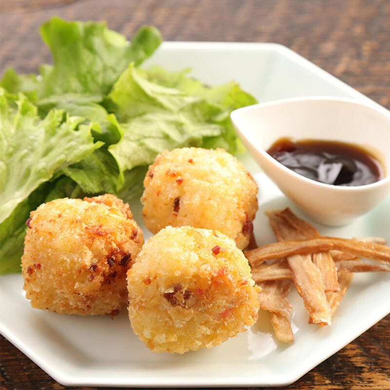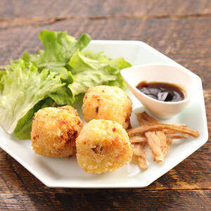 【盛り付け】ラーメンライスコロッケとメンマの唐揚げ、グリーンリーフをお皿に盛り付ける。しょうゆソースをココットに入れ添える。