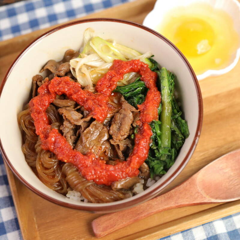 丼茶碗にごはんをもり、すき焼きの具材を盛り付ける。全体にすき焼きあんをかける。<9>でハートを描く。