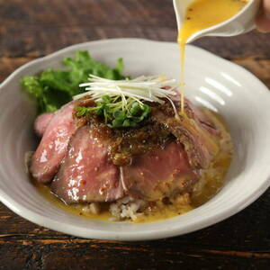 ご飯をよそった器に、薄切りにしたローストビーフ、ベビーリーフを器に盛り付ける。<6>のソースをかける。かいわれ大根と白髪ねぎをのせる。<7>をかける。
