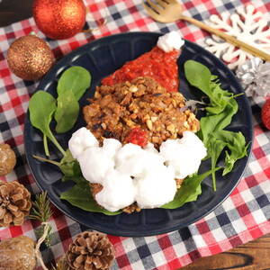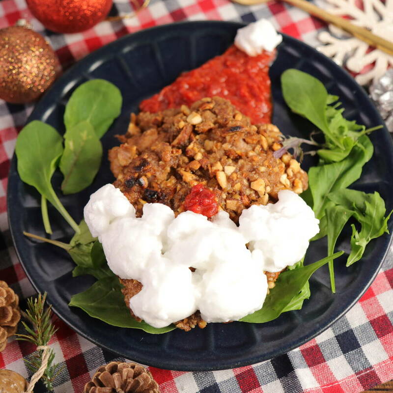 器にベビーリーフをしき、<3>をおく。サンタの帽子に見立てて、<4>をのせる。サンタのひげに見立ててスプーンですくいながら、<6>をのせる。